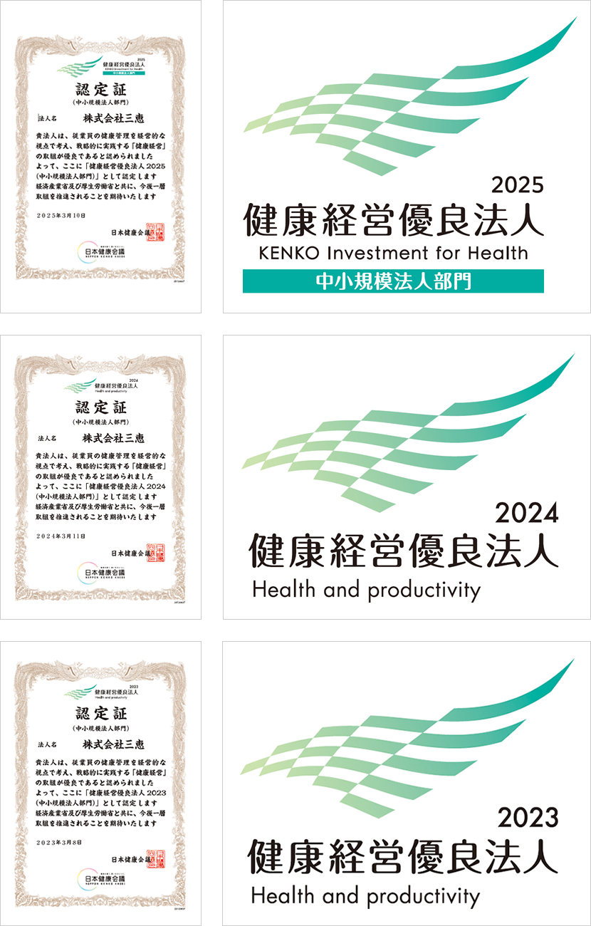 この度三恵は日々の取り組みが認められ、2025年も健康経営優良法人として認定されました。 2023年の認定から今年で3年目となります。本年も社員一同頑張って取組みました。