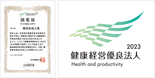 この度三恵は日々の取り組みが認められ、2023年健康経営優良法人として認定されました。 今後も、従業員にとって、健康で健全な企業であるよう、一層取り組みを推進致します。